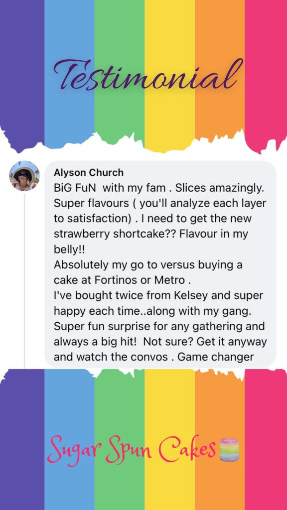 Our most popular cake is The Rainbow, but we can create custom orders to suit your needs. Please contact us for a quote.